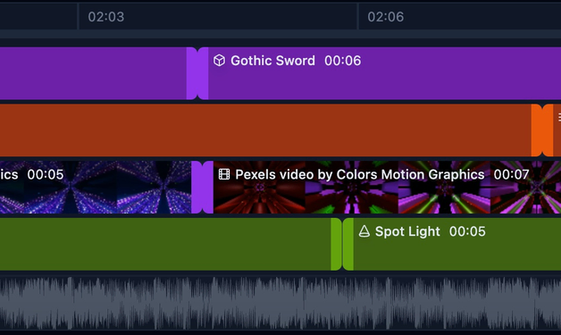 - Timeline Clips: Place elements on the timeline and control their duration.