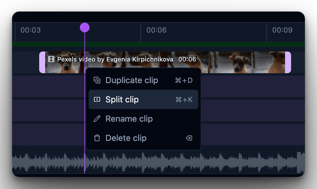 Right-click on a clip and select "Split clip" to split it into two clips.